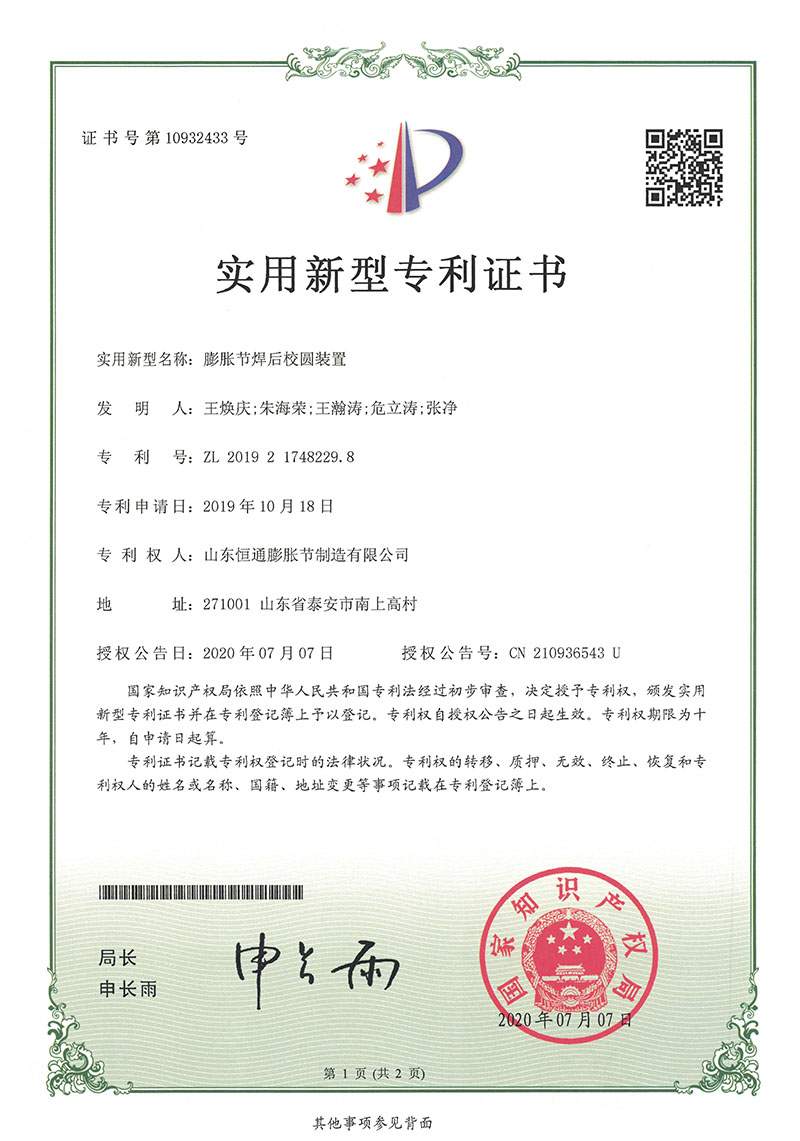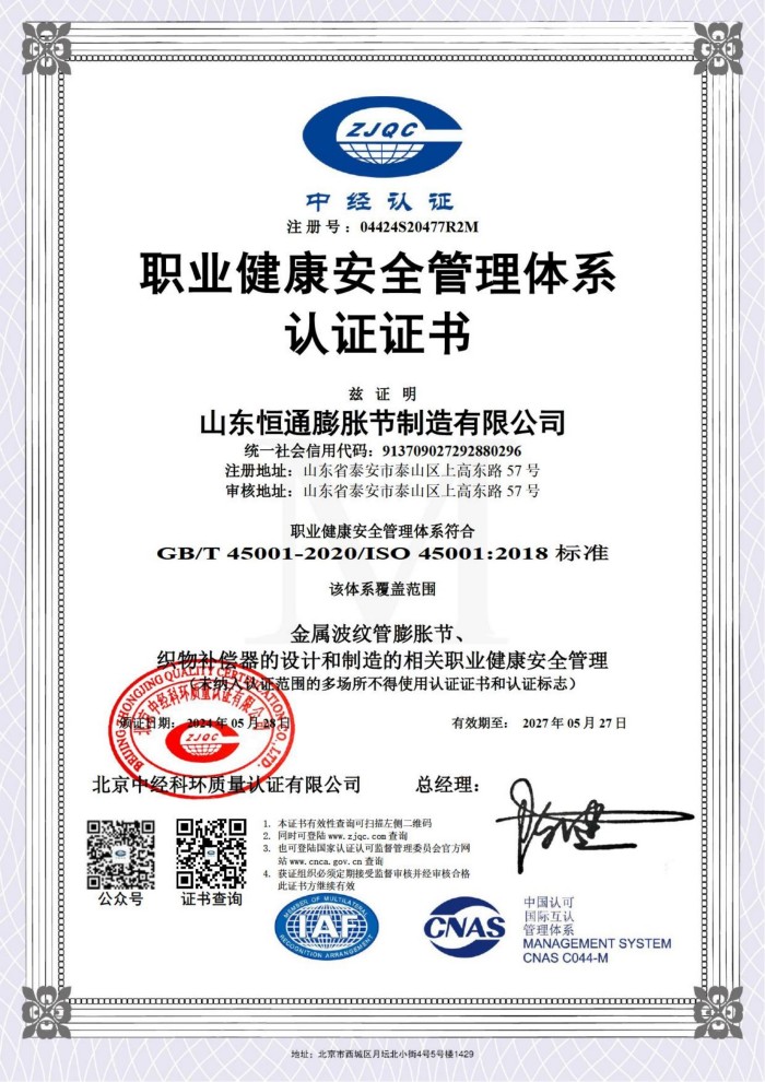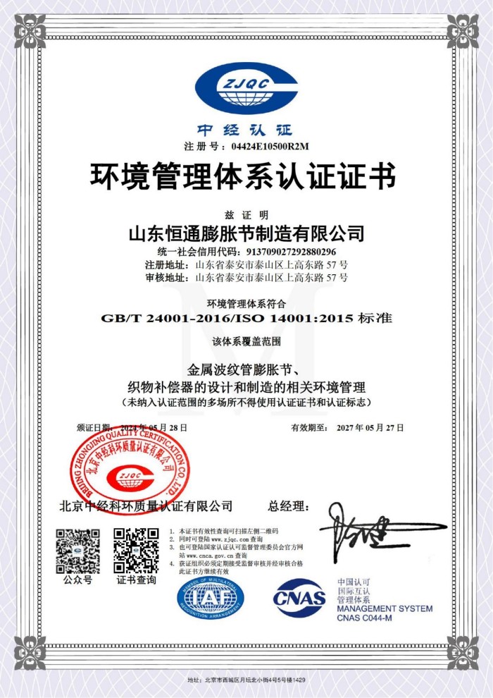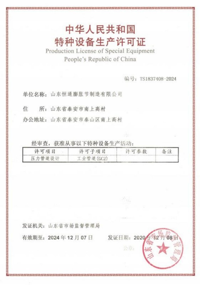 公司取得我國(guó)特種設(shè)備制造許可證、壓力容器A1級(jí)資質(zhì)、壓力管道元件A、B的資質(zhì),并且獲得了歐盟PED-CE認(rèn)證、美國(guó)ASME“U”鋼印、ISO 9000質(zhì)量管理體系認(rèn)證、GB/T 14000 環(huán)境管理體系認(rèn)證及GB/T 45000 職業(yè)健康安全體系認(rèn)證。膨脹節(jié)產(chǎn)品涵蓋壓力管道波紋膨脹節(jié)、壓力容器波形膨脹節(jié)、金屬波紋管、金屬軟管、聚四氟補(bǔ)償器、橡膠補(bǔ)償器及非金屬補(bǔ)償器等。